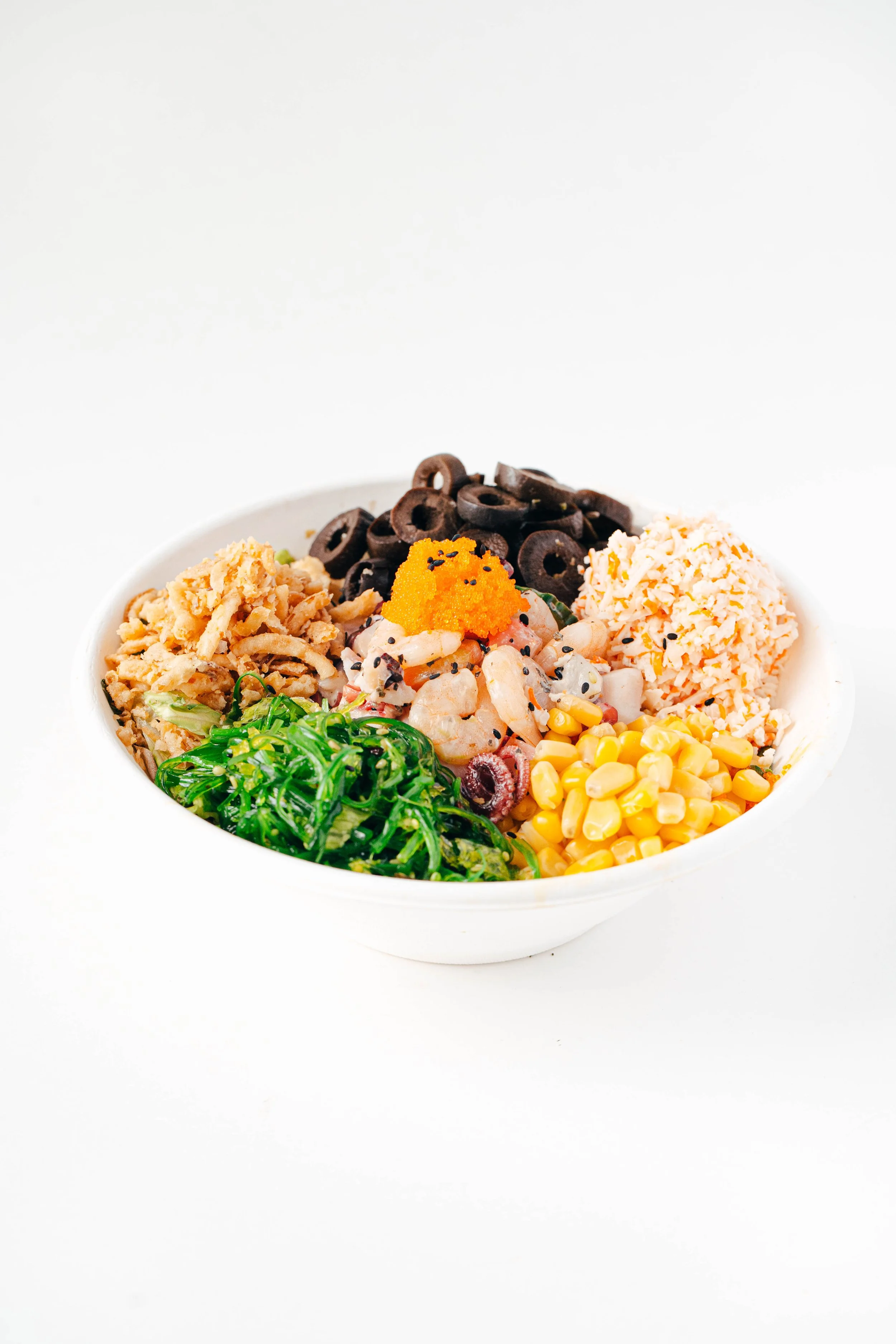 Pulpo, Camaron, Cebolla, Cebollin, Pepino, Lechuga Orejona, Surimi, Ensalada de Algas Marinas, Elote, Semillas de Ajonjolí, Cebolla crujiente, Salsa Wasabi Basil